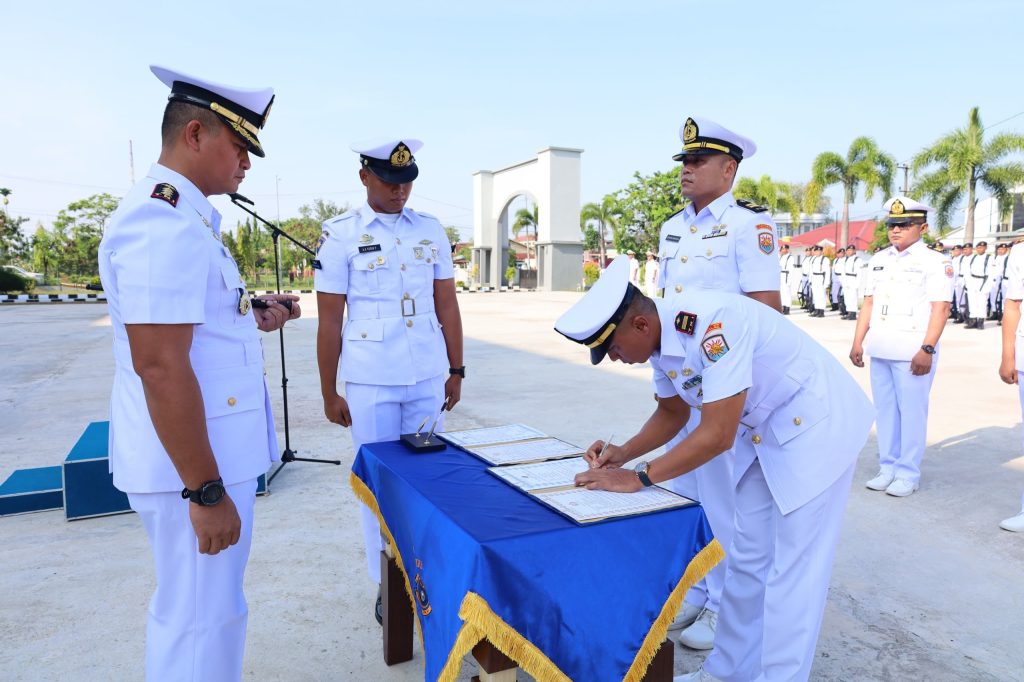 TNI AL, Dumai,- Komandan Pangkalan TNI AL Dumai Kolonel Laut (P) Boy Yopi Hamel, M.Tr. Hanla., memimpin Upacara Serah Terima Jabatan (Sertijab) Komandan Pos Angkatan Laut Selatpanjang dari Kapten Laut (P) Amrizal kepada Kapten Laut (E) Saidul Arifin dan Sertijab Komandan KAL Jemur I-1-38 dari Lettu Laut (P) Dian Sri Hariadi S kepada Lettu Laut (P) Tatang Taryana. Upacara yang yang diikuti seluruh Prajurit dan PNS Lanal Dumai dilaksanakan di Lapangan Apel Mako Lanal Dumai, Jalan Yos Soedarso No. 1, Kelurahan Buluh Kasap, Kecamatan Dumai Timur, Kota Dumai, Jumat (19/4/2024).