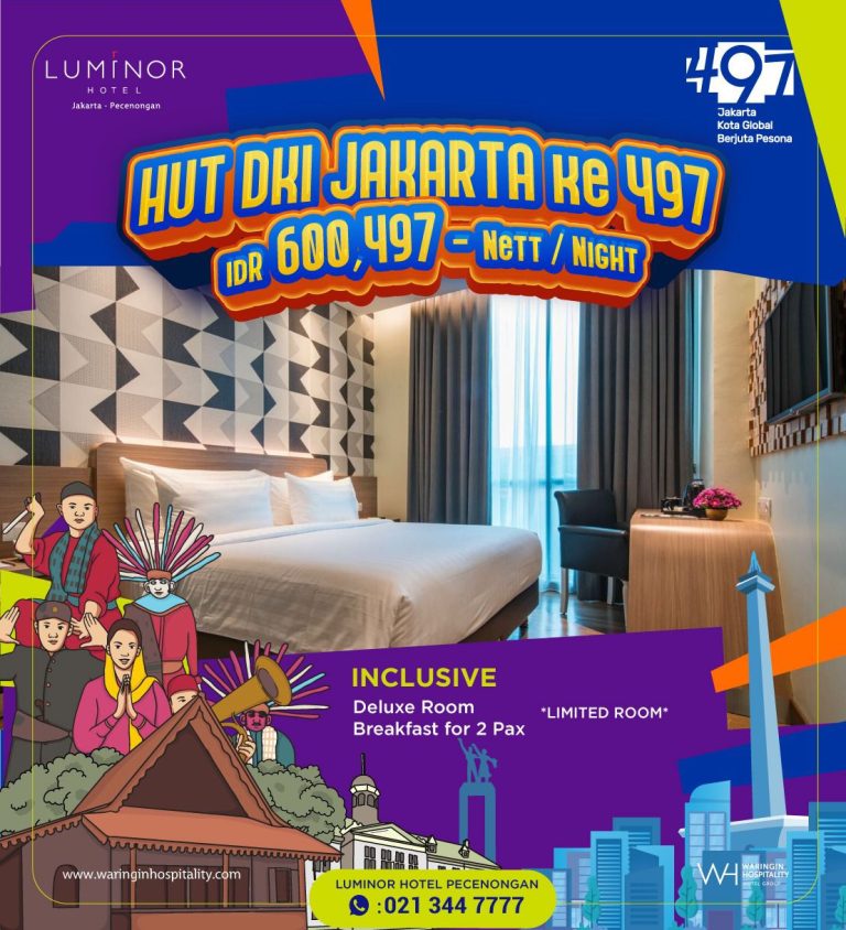 Wartajakarta.com-Dalam rangka ikut memeriahkan HUT DKI Jakarta yang ke-497, Luminor Hotel Pecenongan mengadakan penawaran promo menginap spesial. Dengan harga hanya Rp 600.497 per malam, para tamu dapat menikmati kenyamanan dan kemewahan fasilitas yang disediakan selama bulan Juni 2024.